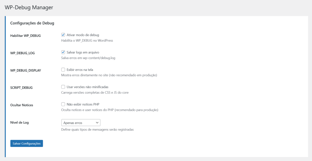 WP-Debug Manager é a solução prática e poderosa para equipes e desenvolvedores WordPress que precisam controlar o comportamento do debug, identificar problemas rapidamente e otimizar performance sem expor logs sensíveis ao ambiente de produção.