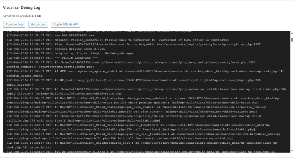 - Visualização em tempo real do debug.log com download e limpeza